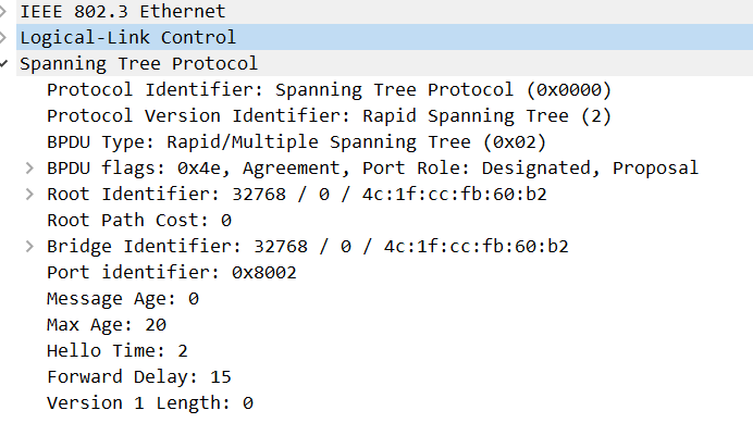 说明:RSTP中的BPDU版本为2,消息类型为0x02。这也意味着一个运行802.1d协议的网桥将丢弃此BPDU,这个特性使得802.1W很容易检测到与之相连的802.1D网桥。