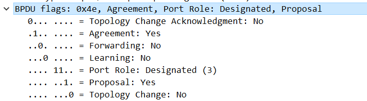 - DP处于discarding或learning状态时,会设置该变量并向下游交换机传递P置位的RST BPDU。